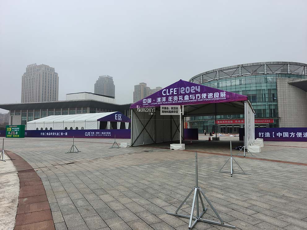 郑州活动篷房租赁助力漯河大型交流展销会现场。在漯河正在举行一场盛大的展销会,此次的主题是年货包装礼盒和方便速食相关,吸引了众多的供应商和行业人员,在这里聚集,在这里交流。郑州活动篷房租赁厂家也来到这里,搭建了一座座展销会篷房,作为明亮宽敞的临时展馆来用。