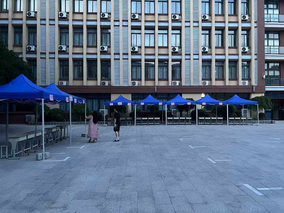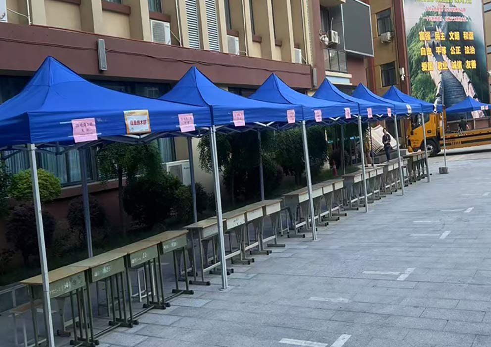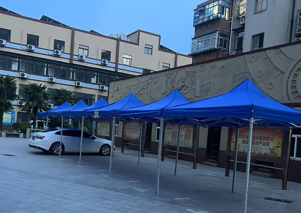 郑州科技工业学校的校园里,几顶蓝色折叠帐篷在阳光下泛着沉稳的光泽。这是郑州篷房出租公司为校园活动布下的临时空间,靛蓝色的篷布与周围的绿树、红砖教学楼形成鲜明对比,却又以恰到好处的尺度融入校园环境,为师生们提供着一片可遮阳避雨的实用角落。