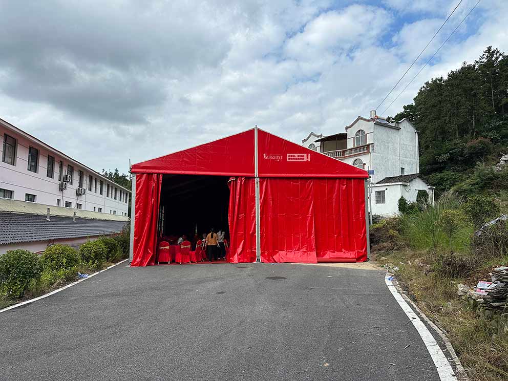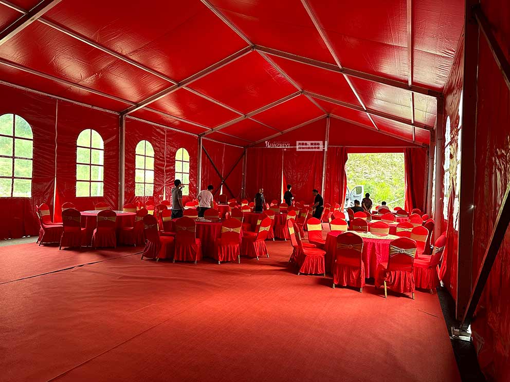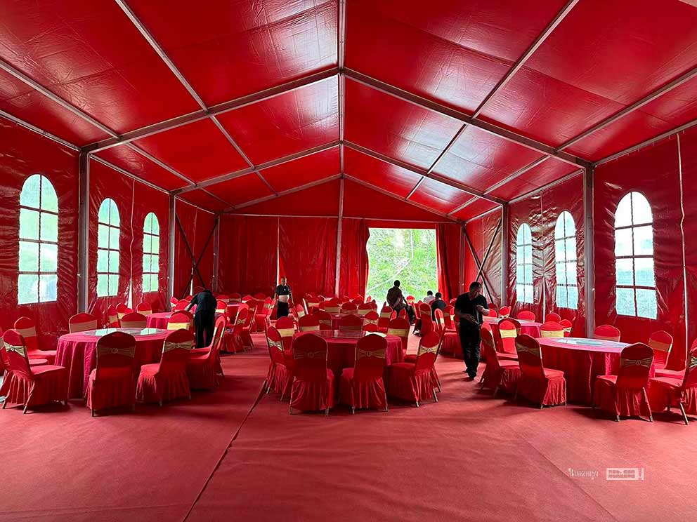 焦作篷房租赁为婚礼搭建的红色篷房,是整个场地布置的核心亮点。篷房采用大跨度人字形设计,篷身选用高密度红色PVC篷布,色泽浓郁饱满,在阳光下呈现出热烈而不失庄重的质感;篷布表面经过特殊处理,不仅防雨防晒,还能有效提升篷内亮度。
