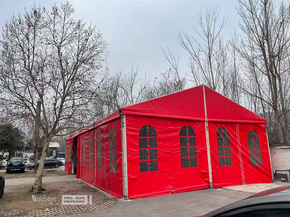 周口篷房出租选用高品质红色篷布,色泽鲜亮饱满、不易褪色,热烈的红色自带喜庆氛围,既适配婚宴、节庆等喜庆场景,也能为展会、团建等活动增添活力,与户外环境相得益彰。篷房采用高强度铝合金框架,结构稳固、抗风防雨,密封性能优异,可有效遮挡烈日、抵御风雨,为用餐人员打造舒适、安全的用餐环境。